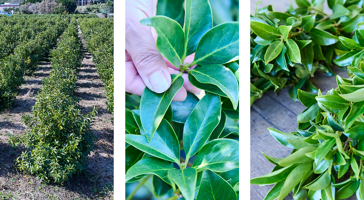 「志き美」(樒:しきみ・しきび)のふるさとは、鹿児島県志布志(しぶし)市。本土の半分がシラス土壌でありながら、全国有数の農業県である鹿児島の東に位置する、自然豊かな地域です。その豊かな自然の水と風、陽光を受けて育った「志き美」は、葉がみずみずしく、日持ちも良いため、外国産と比べて品質がとても良いと好評をいただいています。仏壇やお墓に供えられる樒は、榊と同じく多くの輸入品が市場に出回っていますが、国産品は緑の濃さや艶に明らかな違いがあります。周りが山に囲まれた気候がおだやかな環境で、大切に育てられた私たちの「志き美」。ぜひ手に取ってその美しさをお確かめください。